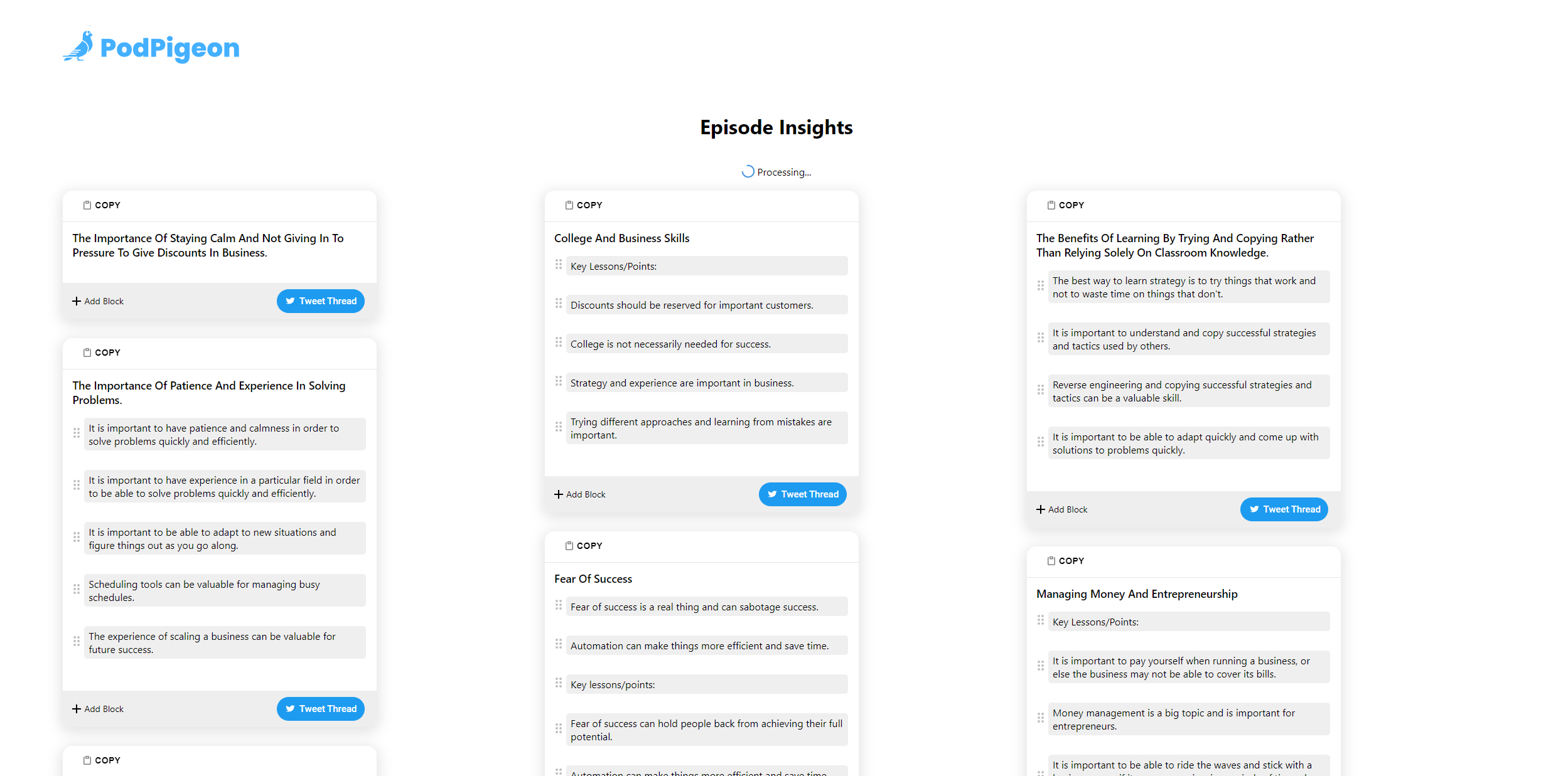 Then we thought, to make unit economics work we need to make this worthwhile for podcasters. This is when I got into Twitter and started seeing people summarize podcasts. Then I thought, what if we make something that converts a podcast into tweets? This was probably one of the most important projects because it connected me with Jason and Jonaed, both of whom I regularly stay in contact with and are my go-to experts on ideas related to content creation. Jonaed was even willing to buy Podpigeon and was using it on his own time. However, the unit economics still didn’t work out (and we got excited about other things).