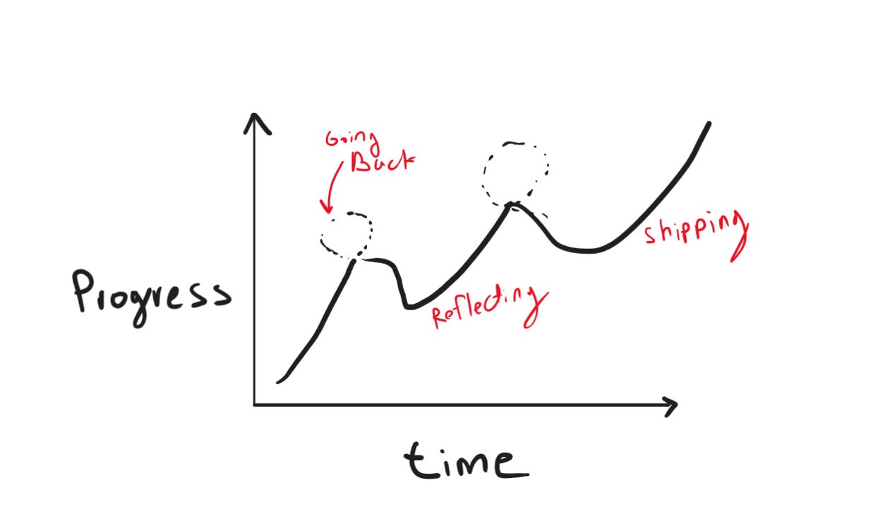 It often feels like we are going in circles because we already tried to commit to do B2B problem discovery but I do also think that our mentality and team culture is changing a lot. We give a lot more priority to validation rather than building, talking to customers instead of getting excited and rushing and committing to a problem rather than hopping from project to project. If I had to place us on that graph, we are here →