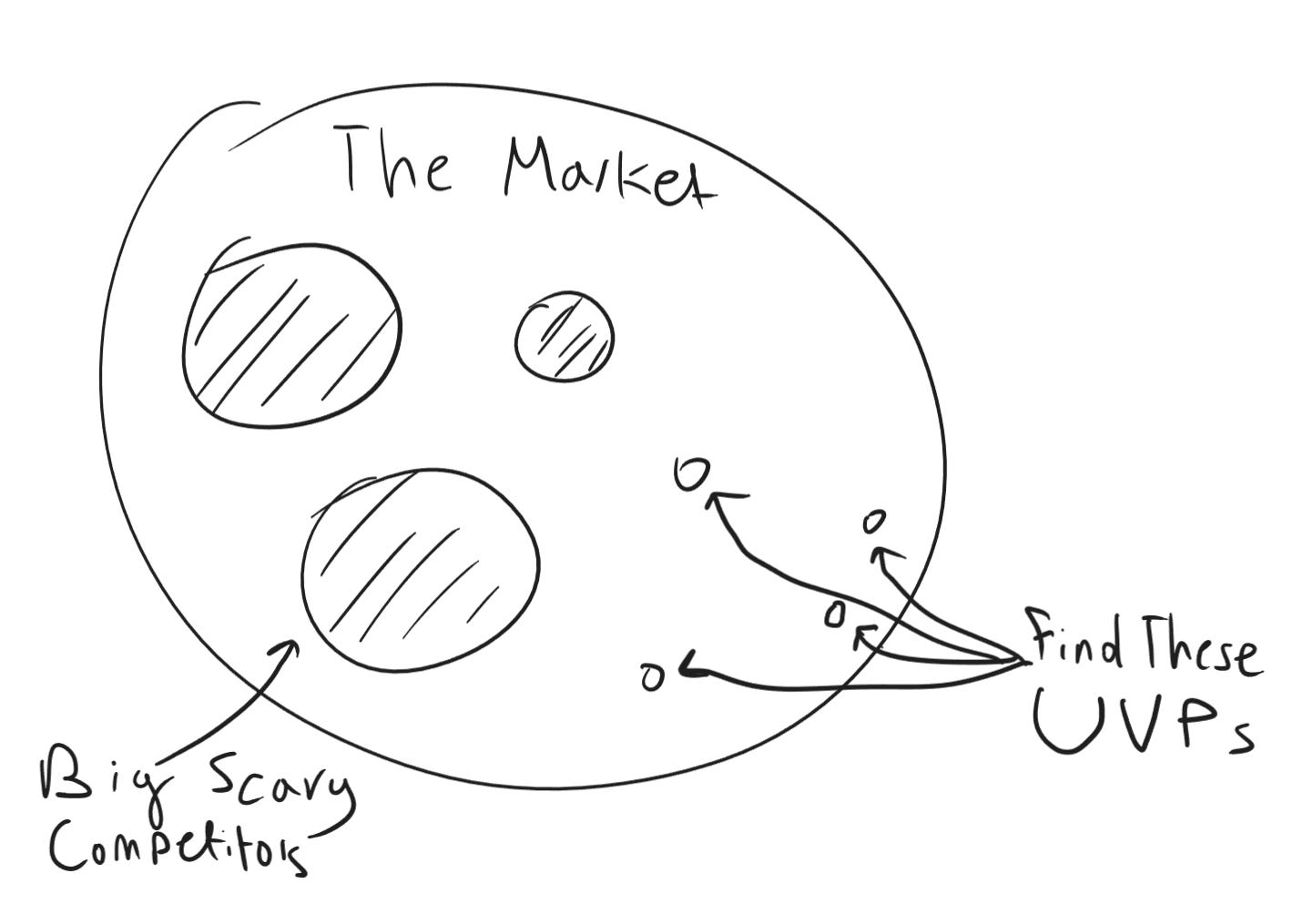 Not having any competitors is usually a red flag. Either you are doing something that is not a JTBD (and unless you are creating a new category, which is unlikely, is going to be useless) or you don’t have a good understanding of the market. Competitors are good because they validate that for once you identified something that is an actual problem worth solving. However, finding a UVP is something that my team struggles with today.
